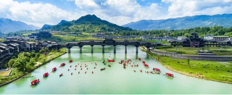 202082311點,世界第一風雨廊橋”——“重慶黔江濯水風雨廊橋下寬闊而清澈的阿蓬江面上,身穿民族服裝的阿哥阿妹俏生生地站在佩戴紅綢和大紅花的喜船上,在艄公的牽引下上演一場別開生面的鵲橋相會,吸引了來自全國各地的游客駐足打卡拍照。