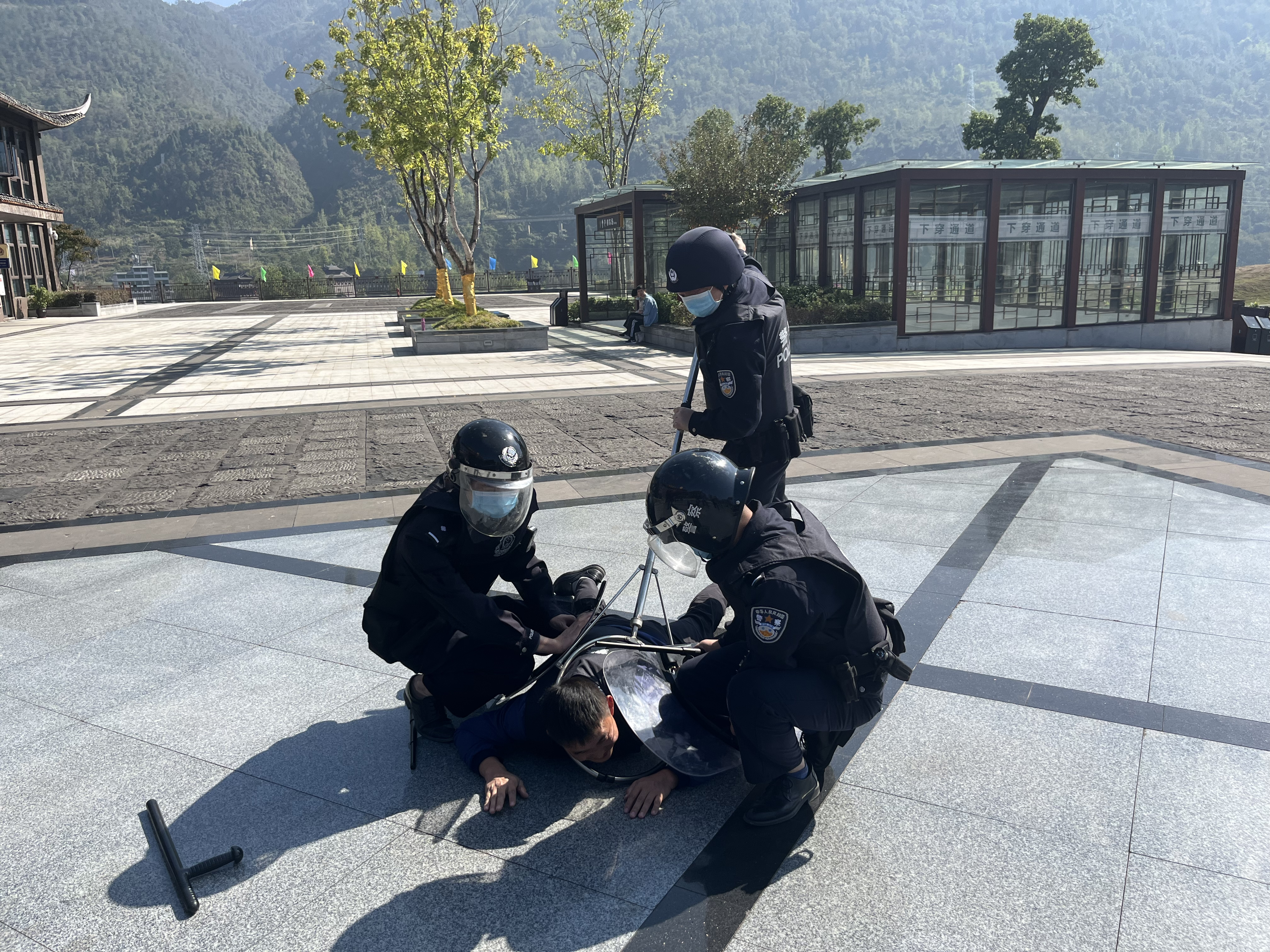 培訓中,濯水鎮派出所警務技能教官為景區員工普及了相關知識,講解了專用器材的使用方法、安全注意事項及攻防技能,并進行了現場演示。參訓人員認真學習了各種器械的使用,并在教官的指導下熟悉動作要領。隨后,在濯水景區主游客中心廣場前實地開展了反恐防暴應急演練,演練模擬“暴徒”在人員密集區域持刀襲擊游客,景區巡邏安保和屬地民警迅速趕到現場,與“暴徒”展開搏斗,最終聯合將其制服。通過將近兩個小時的培訓和演練,提高了景區安保人員應急處置以及保護游客有效逃生避險的能力。