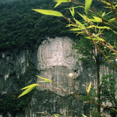 景區(qū)內(nèi)坐落著一座巨大的觀音摩崖像,這尊觀音像像高123米,寬69米,是目前世界最高的觀音雕像。觀音手執(zhí)凈瓶柳枝,端坐蓮臺(tái),指灑圣水,面目和祥。傳聞對(duì)著觀音像虔誠的許下心愿,就能實(shí)現(xiàn)。
