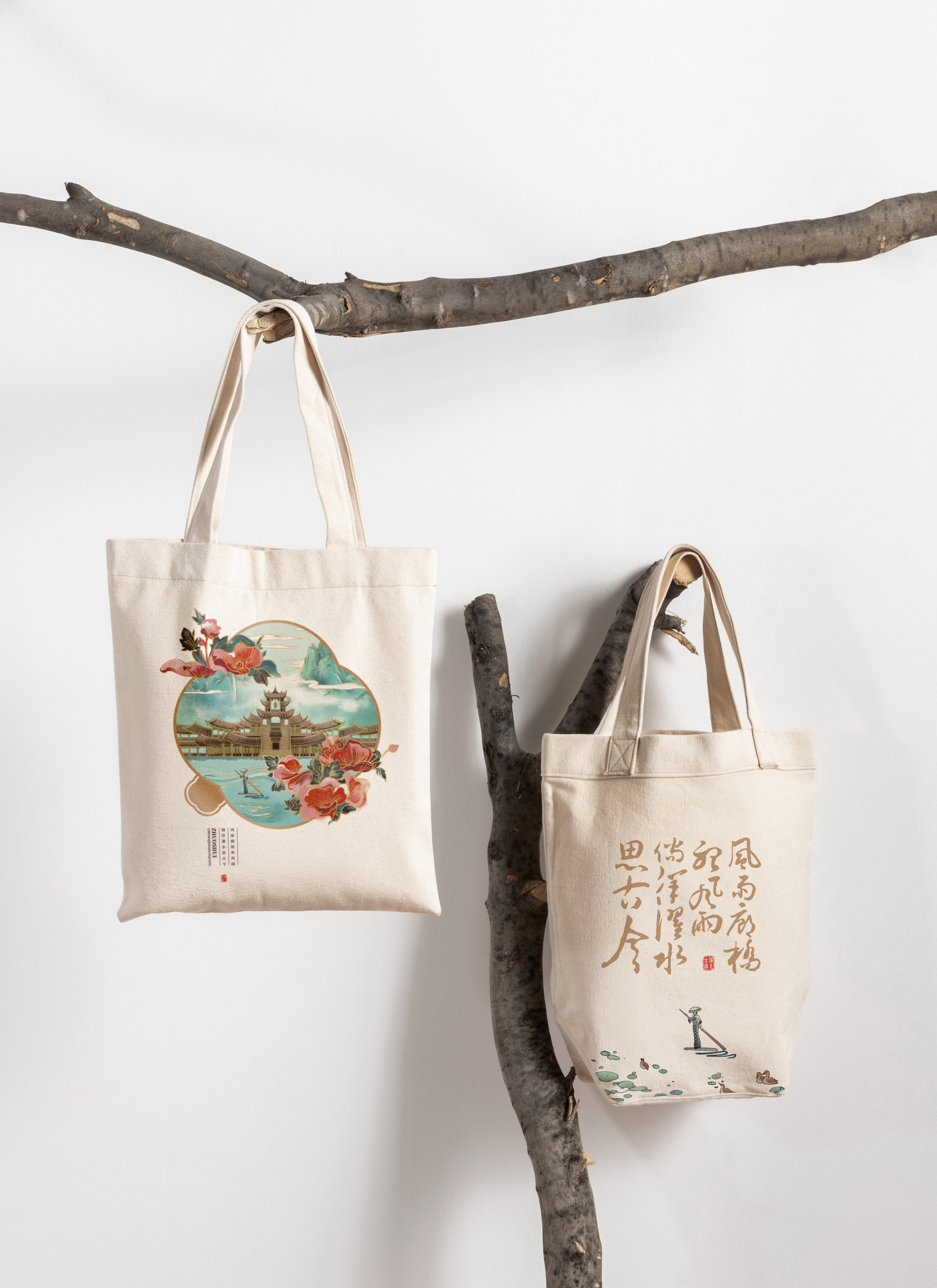 品名:濯水文創▪光影濯水帆布包售價:20元產品說明:手繪風雨廊橋作包身圖案,緞面材質與黑金色結合..