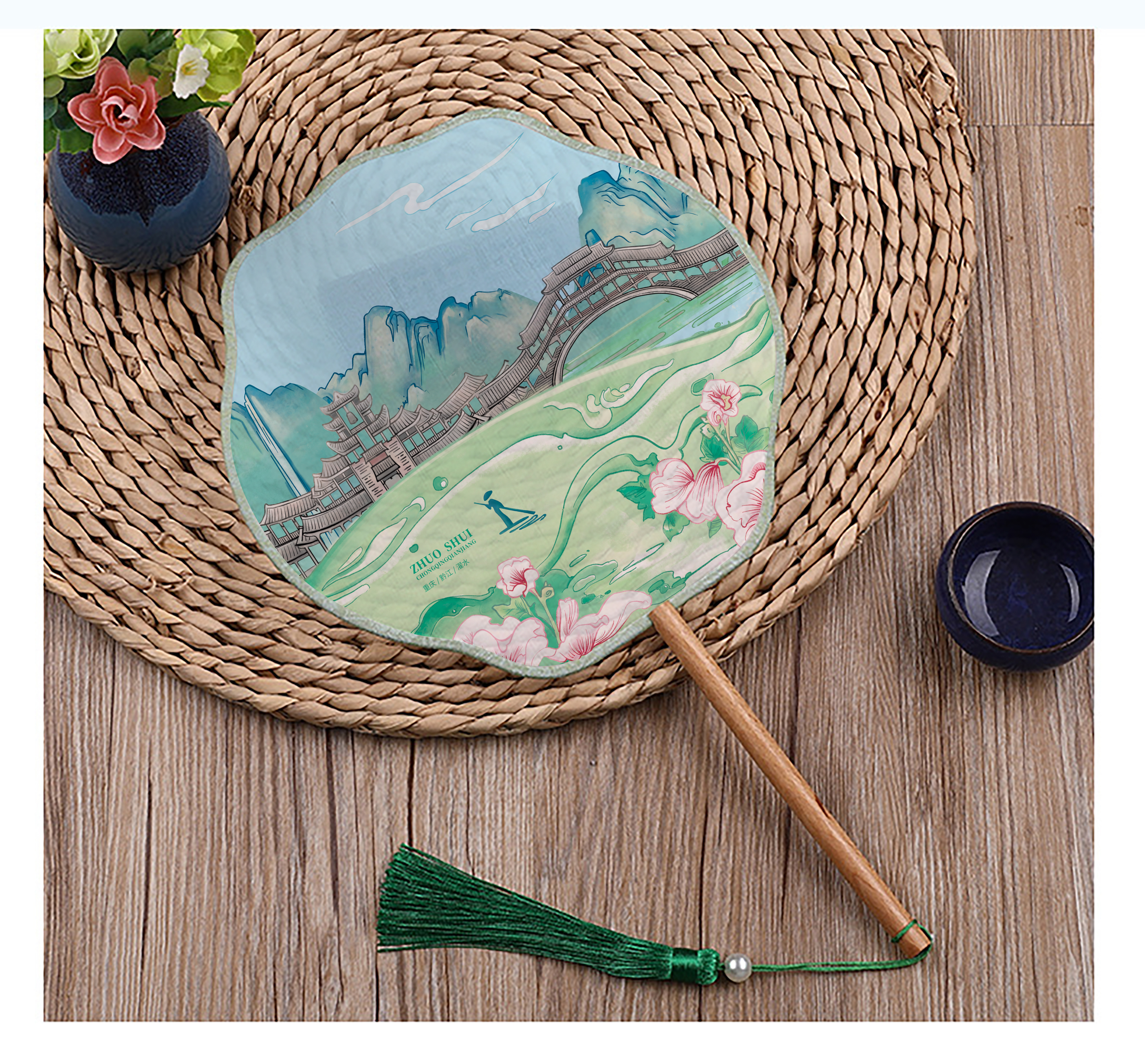 品名:濯水文創▪古濯如畫團扇(兩款)售價:35元產品說明:以岱山秀水間,形如波浪起伏,狀若龍行鳳..